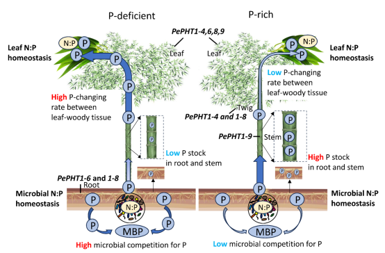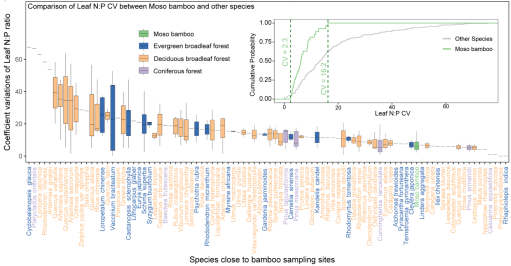 进一步研究证实,这一灵活机制是毛竹在竞争中胜出的关键。与周边绝大多数树种相比,毛竹叶片氮磷比的变异系数相对较低,生产力却能高出约25%。该研究不仅揭示了毛竹作为速生植物成功的生理生态学基础,其提出的“分区稳态”概念更创新性突破了传统生态化学计量学中稳态与可塑性对立的经典范式,为预测和调控森林生产力对全球变化的响应提供了新理论框架。